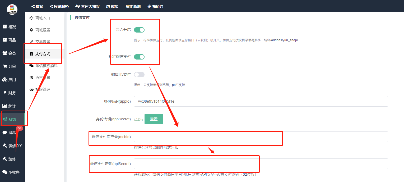 第五步;把获取的微信支付商户号-密钥-商户证书,上传到商城的后台。
