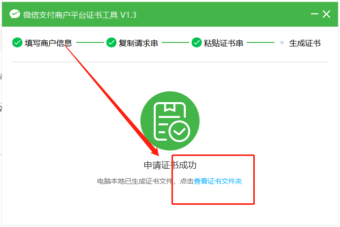 (注;一定要记得点击查看证书文件夹,把证书保存好,需要上传到商城的后台)